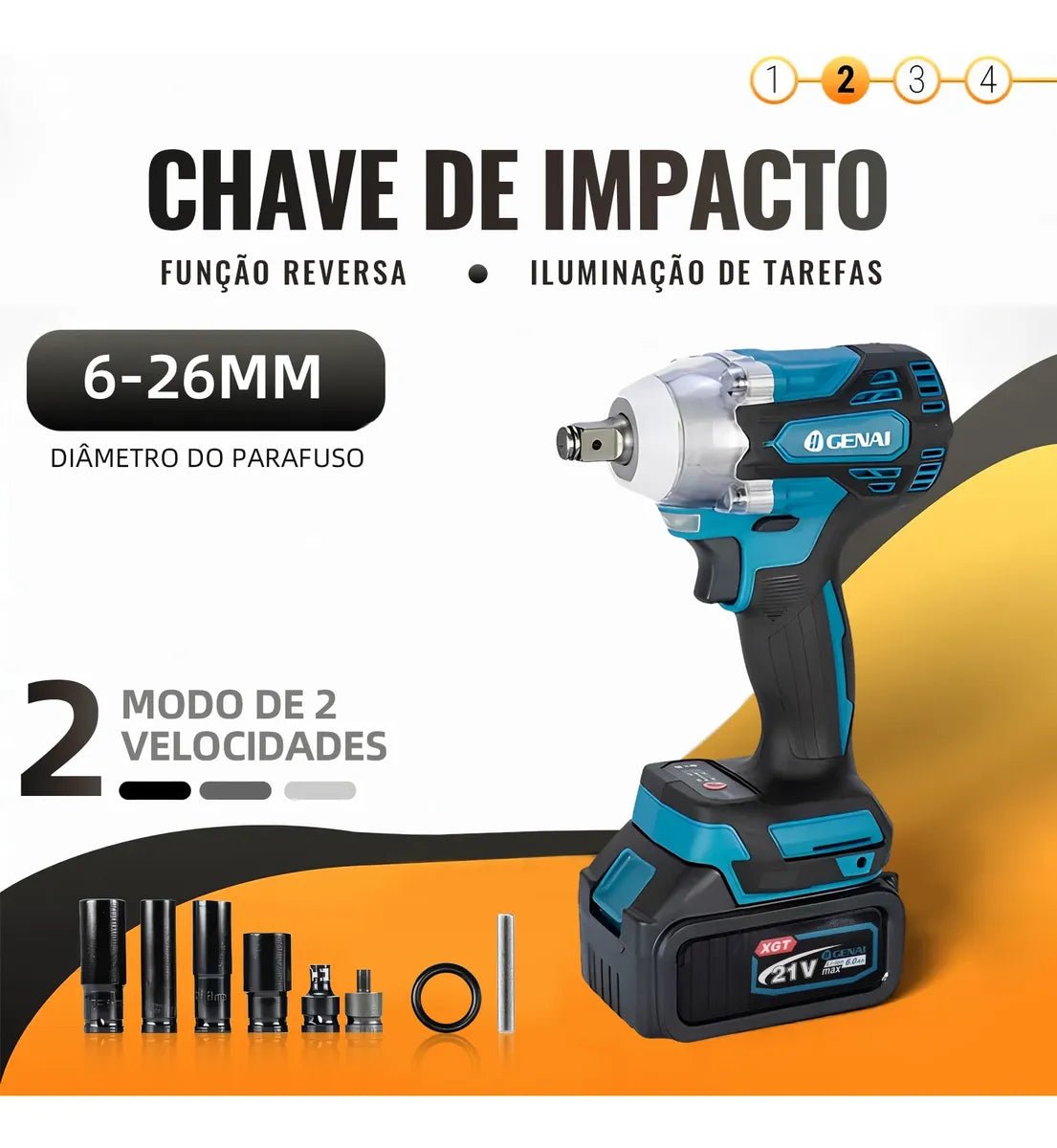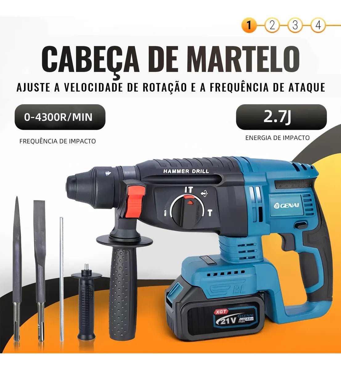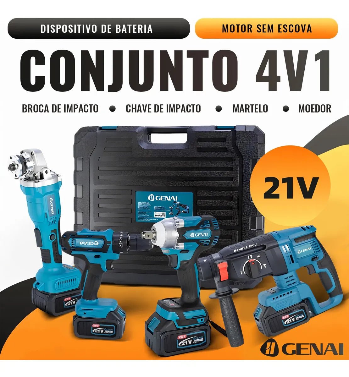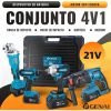 O Kit 4 em 1 reúne Furadeira de Impacto, Chave de Impacto, Martelete e Esmerilhadeira em um único conjunto profissional. Um equipamento exclusivo que eleva seu desempenho a outro nível, seja na obra, no reparo ou no acabamento.