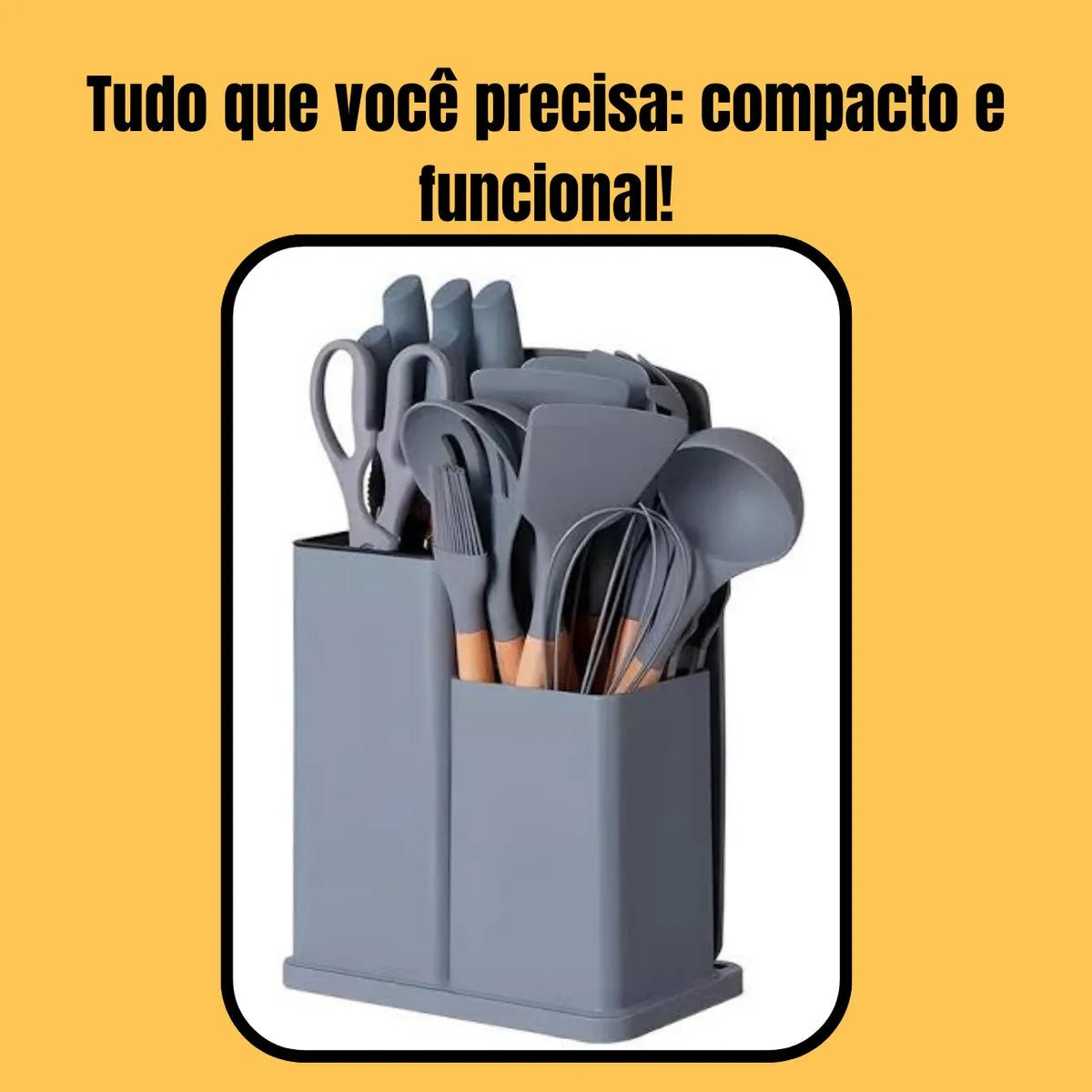 Leve praticidade, organização e estilo para a sua rotina culinária com o Kit de Utensílios de Cozinha 19 Peças. Produzido com materiais premium e pensado para quem valoriza eficiência e durabilidade, esse conjunto oferece tudo o que você precisa — do preparo ao acabamento do prato.