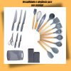 Além dos utensílios clássicos, o kit acompanha 5 facas afiadas, tesoura multifuncional, tábua para corte e pegador com cabo em inox, garantindo versatilidade completa para qualquer receita.